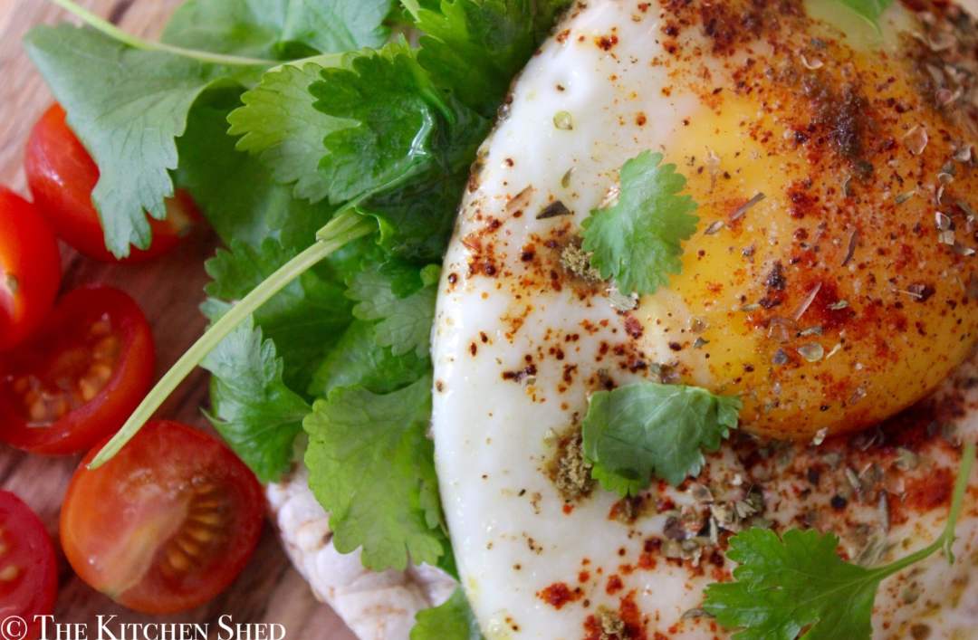I’ve got the Mexican bug again (It happens every now and then) usually when I have a pot of coriander to use up and I try to think of all the ways I can use it up in a recipe. This egg is simple to make but packs a massive flavour punch when served on a wholegrain rice cake, topped with smashed avocado and cherry tomatoes….. YUM! Give it a try!